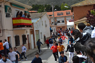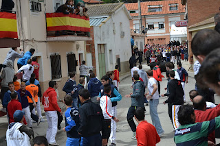 En el 2012 este pueblo nos recibe con bastantes aficionados a los encierros, hace un día estupendo y tenemos un buen trayecto de bajada, una curva hacia la derecha, luego una recta bastante plana (allí es dónde nos ubicaremos) y finalmente una estrecha curva a la izquierda para bajar a la plaza de toros. Ya a pocos minutos, Anchuelo irradiaba alegria y se podia ver los espectadores de todas las edades reservando su pedacito de talanquera para poder tener una visual del espectaculo; recortes y carreras.
