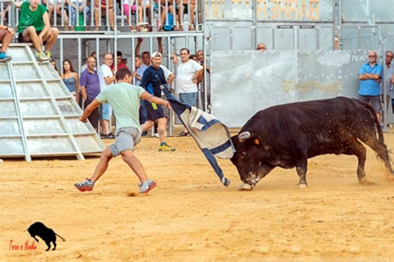 Por la noche, se realizó un encierro de toros embolados, a cargo de la ganadería castellonense "El Gallo", para proseguir, con la exhibición de una vaquilla y embolada de un toro de "La Paloma". Si por la tarde, el recinto estaba lleno hasta los topes, (siendo una plaza muy grande), por la noche no cabía un alma, como se suele decir, así que decidimos dejar las cámaras en el coche y no arriesgar.