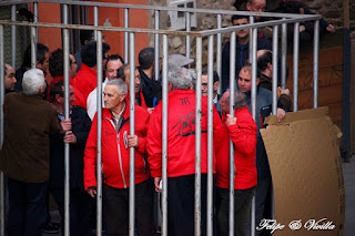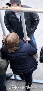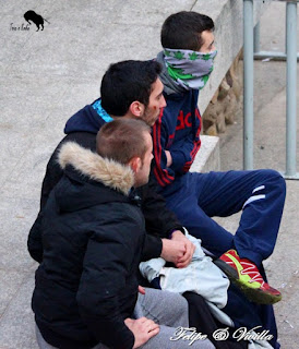 los aficionados ponen unos tableros, quedándose detrás de él sujetándolo. Una de