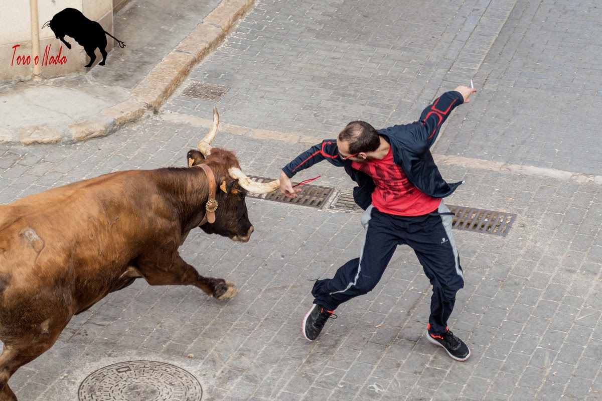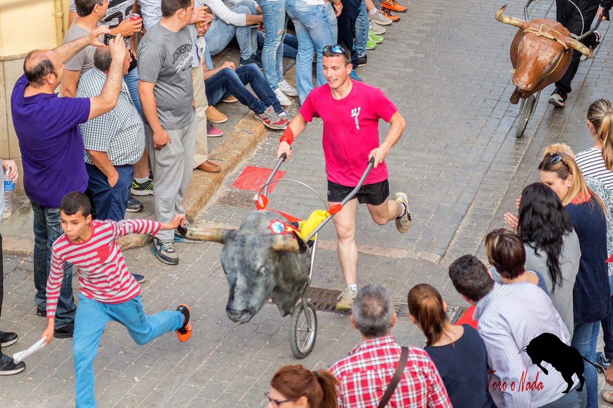 Empezó el día con un carretón en cuerda para los más pequeños, sobre las 12:30h, donde los más pequeños disfrutaron y al mismo tiempo iban cogiendo afición. Sobre las 14h, daba comienzo la entrada de toros y caballos, resultando rápida y vistosa,