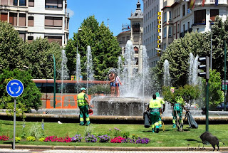 Muchísima gente y calor una combinación que incitaba refrescarse, el blanco de los trajes desaparecía con los minutos de espera que en total fueron veinte por un tema que no merece la pena mencionar. Llegamos una hora antes de la cita, nos acomodamos en la puerta de un portal, que más tarde sirvió de refugio para los que les faltaba el aire, vimos chicas que hicieron de enfermeras para ayudar a sus congéneres.