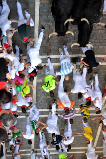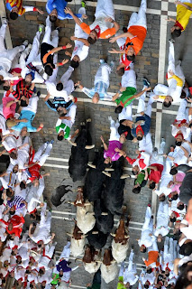 El primer Toro Toma con fuerza la cuerva de Mercaderes sin acercarse a la compuerta de Madera, va mas bien por el centro de la calle con mucha fuerza arrollando todo a su paso, veloz, y unos 30 metros atrás le sigue la manada que entra a Estafeta Toros por delante con un ritmo menos desenfrenado. Cuando el astafino que iba por delante alcanza finalmente al cabestro los corredores aprovechan para ponerse delante, el pitón izquierdo detrás del manso y el derecho para los que apenas podían aguantar. Cada vez se arropaba más,
