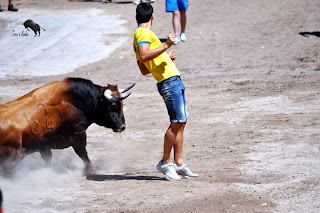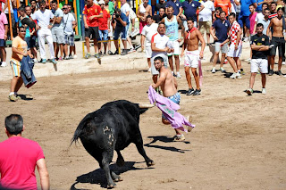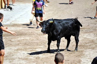Después del encierro se probaron dos toros. Dieron su juego para el calor que hacía. La plaza tiene todos los obstáculos imaginables, pirámide, plataforma, barca, un murito perimetral de 40 centímetros con barandilla baja, una fuente con escaleras en el centro, y rodeada toda ella por cadafales don barrotes.