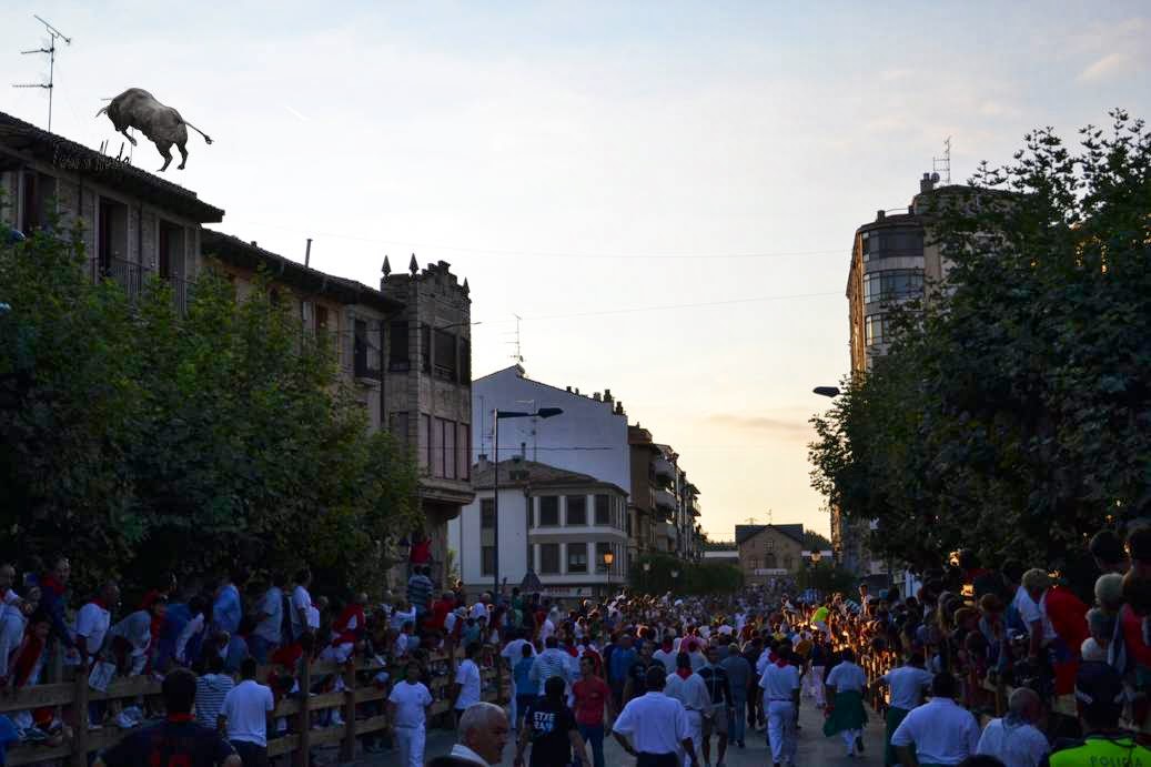 a uno, y el sexto toro empieza a sacar la cara, hace hilo a varios de los mozos