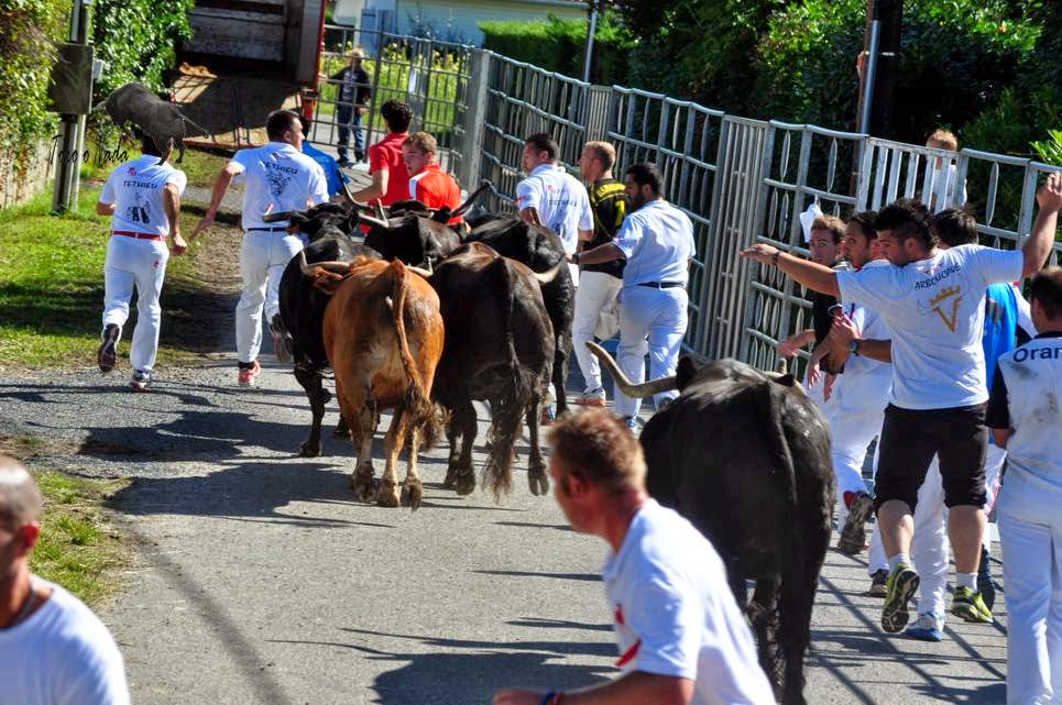 El segundo día en Tethieu fue muy completo, con dos encierros matinales, almuerzo y comida. A las 10:45 comenzaba el primero de los encierros con vacas de Dargelos. Ocho fueron las vacas, con 12 pasadas, tres idas y vueltas, descanso y otras tres idas y vueltas.