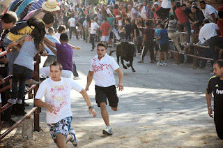 ver en Velilla como se cita al novillo en plena carrera de bajada con chaquetas