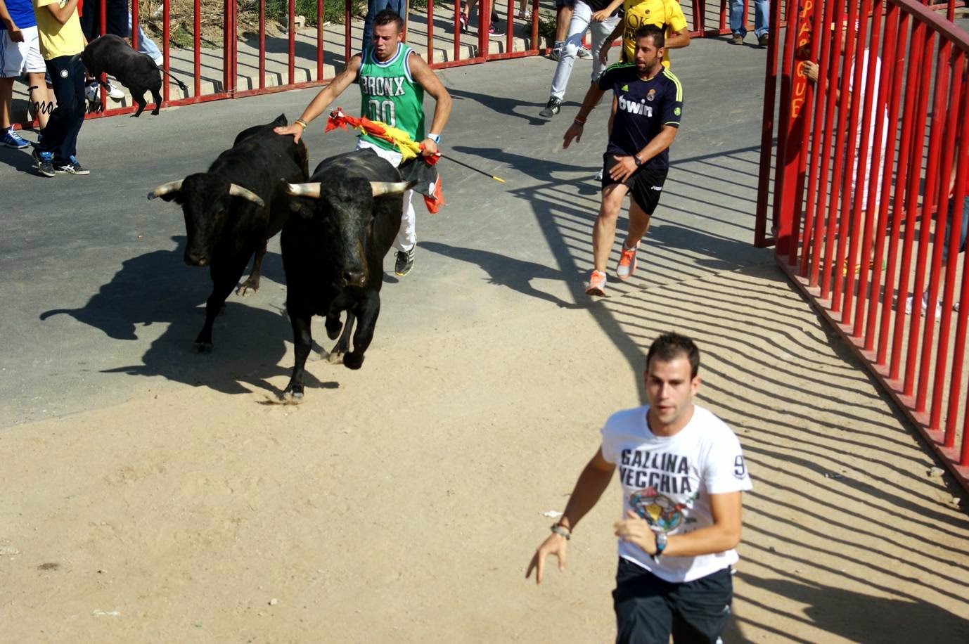 un par de novillos por las calles. Los suelta de uno en uno y luego saca a los