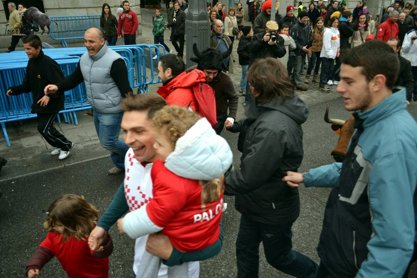 Vinieron las uvas, las felicitaciones, el inicio del año taurino y los encierrillos. La calle del Correo es cuesta arriba, empedrada, salvando las distancias, aquello parecía Santo Domingo. Las familias que se habían pasado a la prueba de las uvas, veían el espectáculo, los niños les pedían a los padres poder dar otra carrera, a lo que estos al ver la cara de emoción y satisfacción de los hijos, como les iban a decir que no??? Al final cuatro carreras dobles para los peques, de subida en manada, con los dos carretones juntos y de bajada, en las que los carretones iban más lentos y de uno en uno. Intercaladas entre estas carreras una para los mayores, en la que era difícil coger posición, había más "codos" que en Estafeta. Muchas risas, caras de emoción, y lo que más gustó, era que los transeúntes preguntaban que si para el año siguiente también se iba a hacer. Incluso algunos daban las gracias por haberles hecho pasar un momento tan bueno, gente que no se les conocía de nada. Algunos que aguardaban cola para ver el belén de la casa de correos no les importó perder la vez para unirse a la fiesta.